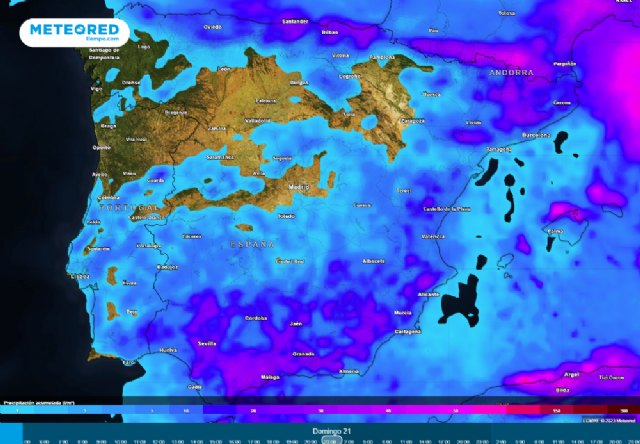Acumulados de precipitación previstos hasta la noche del domingo en la Península y Baleares.