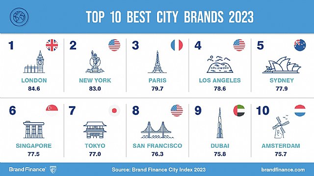 Con una puntuación de 84.6/100, Londres encabeza el ranking inaugural Brand Finance City Index, resultado de una encuesta mundial a 15.000 personas.
