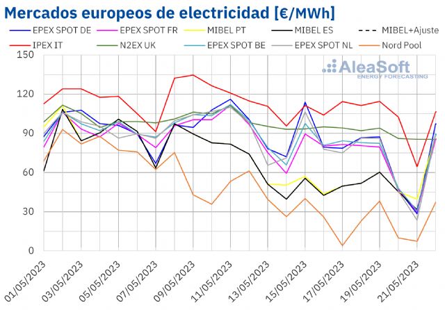 En la tercera semana de mayo, se registraron precios negativos o cero en la mayoría de los mercados eléctricos europeos, especialmente durante el fin de semana. En el mercado Nord Pool, los -5,67 €/MWh registrados en una hora del domingo 21, son el valor más bajo de la historia. En el conjunto de la semana, los precios bajaron en todos los mercados, gracias al descenso de la demanda y de los precios del gas, y a una producción solar y eólica más alta que la de la semana anterior en varios mercados