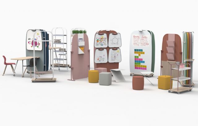 Cumplen perfectamente esta función los paneles separadores móviles, pensados para diferenciar espacios y actividades. Los paneles separadores configuran las sesiones de trabajo de forma rápida y sencilla según las necesidades del proyecto y las características de la actividad. Además, en ellos se puede escribir, compartir ideas, colgar pizarras y contenedores.
