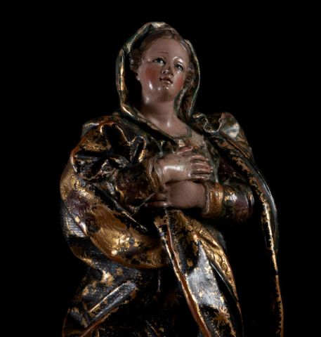 Los detalles de la obra ‘La Inmaculada de los ojos azules’ son excelsos, delicados y bellos. En ella, la Madre de Dios mira al cielo con un inocente gesto de ternura e inocencia bajo dos deslumbrantes ojos azules en cristal pintado como los que se conocen de varios modelos ejecutados por ‘La Roldana’. Su cuerpo está cubierto por un delicado manto verde dorado, puntillado y esgrafiado con bordes dorados cuajados de detalladas florituras de rosas pintadas. Bajo los pies de la Virgen Santísima, cinco risueños ángeles de inapelable factura miran al espectador con ternura. El grupo escultórico está realizado en terracota dorada y policromada conservando toda su policromía y dorados de origen y medidas de 43 x 23 x 14 cm.