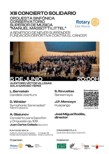 Este estreno absoluto es una de las grandes novedades que presenta una nueva edición del Concierto Solidario que el Conservatorio Superior de Música de Murcia 'Manuel Massotti Littel' organiza junto Rotary Club Murcia para fomentar la educación, el arte y la solidaridad. En esta edición, el dinero recaudado con la venta de entradas irá destinado a la Fundación Deportiva contra el Cáncer 'Never Surrender'.