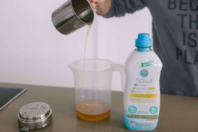 La botella Souji está disponible para hacer la mezcla en el mismo envase ecológico y es 100 % reciclada y 100% reciclable. Además, cuentan con un formato recarga de 5l para reutilizar la botella las veces que se quiera. En primer lugar, se deben medir las proporciones correctas del aceite usado previamente filtrado y de Souji, según las instrucciones de cada envase. Posteriormente, se mezcla el aceite con Souji y se agita la mezcla durante un minuto, se recomienda dejarlo en reposo por algunos segundos, con el fin de que baje la espuma y los aromas no necesarios se evaporen. En ese momento, se obtiene el limpiador cremoso, listo para utilizarlo como detergente de ropa, lavavajillas y friegasuelos, un 96 % menos contaminante que un detergente común, hipoalergénico y con agradable aroma floral.