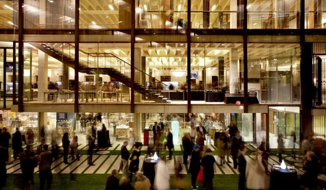 Foro de Expertos en el Auditorio y experiencias de networking durante un evento en la planta Jardín del COAM.