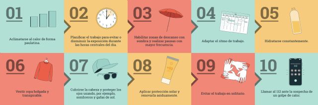 Para facilitar el acceso a toda la información, el Instituto Nacional de Seguridad y Salud en el Trabajo ha habilitado un espacio específico para esta campaña en su web que contiene, entre otros materiales, el decálogo de consejos y recomendaciones para combatir los efectos dañinos de la exposición a altas temperaturas y radiación solar.