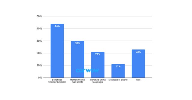 Por tanto, podría parecer que el vehículo eléctrico está viviendo su época dorada, pero quizá esta no sea la realidad. Según datos de un estudio con múltiples respuestas llevado a cabo por carwow, comparador de vehículo nuevo líder en el mercado, entre conductores de toda España, solo el 30% estaría considerando adquirir un vehículo de estas características, en contraposición con el 38% registrado hace dos años, en 2021. Entre las razones que los conductores destacan para decidir comprar un coche eléctrico se encuentra, en primer lugar, los beneficios medioambientales, que lo señala un 44%. A continuación, señalan los menores costes de mantenimiento que acarrean, mencionado por un 23%. Asimismo, el 16% destaca que este tipo de vehículos cuenta con la última tecnología, mientras que únicamente el 9% se fija en el diseño como razón para adquirir un vehículo eléctrico.