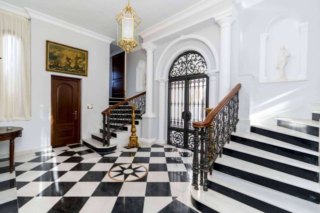 Por su parte, el interior de la villa contiene un amplio comedor, una cocina totalmente equipada, una sala de televisión tipo dormitorio y varios salones señoriales con vista al jardín, al campo y al mar Mediterráneo. Mientras que la escalera de la entrada principal conduce a una galería que rodea el patio interior, donde se encuentran los dormitorios cuidadosamente decorados.