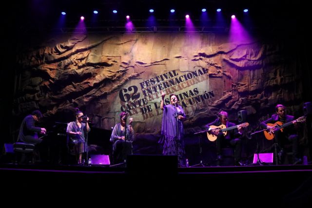 El jaleo de su gira '40 años de flamenco' empezó pronto por tangos de Granada, con 'Cintas de color grana', que enmudeció al público, expectante por contemplar a una de las máximas representantes del cante jondo. La cantaora, "agradecida y satisfecha de volver a La Unión", quiso recordar lo más importante de su carrera, por eso su disco 'Antología: la mujer en el cante' estuvo muy presente, así como las letras de algunos de los poetas más destacados de nuestro país. Acompañada de Salvador Gutiérrez y Edu Espín a la guitarra, Pablo Suárez al piano, y Ana María González y Rosario Amador a las palmas y coros, siguió el recital acompañada solo por una guitarra, mostrando el formato más puro del flamenco, con 'Andaluces de Jaén', de su último trabajo, para dar paso a las cantiñas y uno de sus temas más afamados: 'Toma este puñal dorao'.
