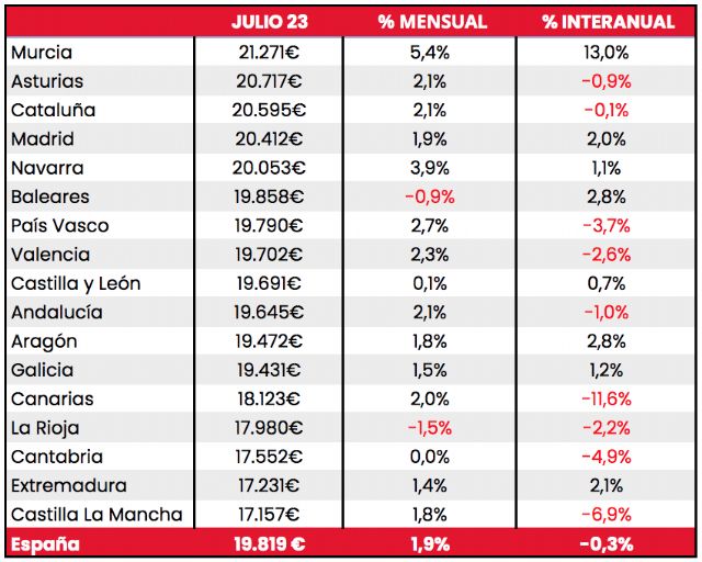MURCIA, LA COMUNIDAD CON EL PRECIO MEDIO DE OFERTA MÁS ELEVADO EN JULIO
