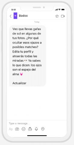 Este verano, Badoo lanza "Mejor sin gafas de sol" para ayudar a su comunidad a mejorar sus perfiles de citas. Los usuarios que tengan varias fotos con gafas de sol recibirán un aviso amistoso para recordarles que pueden estar perdiéndose el "amor a primera vista" y animarles a cambiar sus fotos de perfil para tener más posibilidades de establecer una conexión significativa.