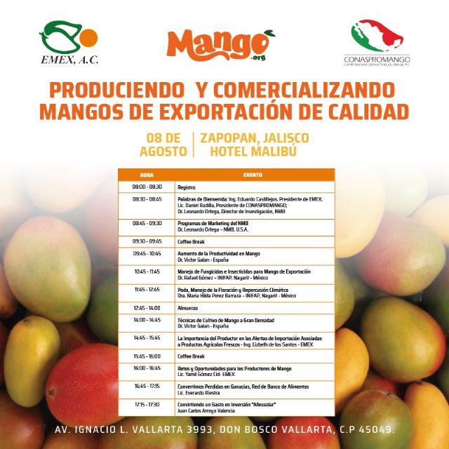 La Asociación de Exportadores de Mango de México (EMEX) junto a CONASPROMANGO (Comité Nacional Sistema Producto Mango) en colaboración con la National Mango Board realizarán un nuevo taller denominado "Produciendo y Comercializando Mangos de Exportación de Calidad", que se celebrará el próximo 8 de agosto en el hotel Malibú en Zapopan (Guadalajara) en México, en el que participarán prestigiosos ponentes y el Director de Investigación de la NMB, Dr. Leonardo Ortega, quien disertará sobre los Programas de Marketing de la National Mango Board.