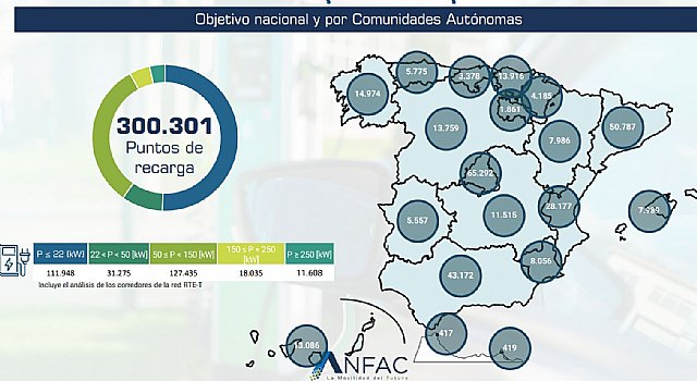 De acuerdo con estos nuevos objetivos, ANFAC ha actualizado su propuesta para planificar y monitorizar, año a año y, a nivel cuantitativo y cualitativo, el desarrollo necesario de infraestructura de recarga de acceso público a nivel nacional, comunidades autónomas, provincias y principales corredores. La metodología se basa en los principios generales establecidos en el estudio de impacto que la Comisión Europea tomó como base para el nuevo AFIR y en los parámetros defendidos por ACEA; resultando una red mínima de puntos de recarga de acceso público para Murcia, de aproximadamente 1.111 puntos de recarga de acceso público en 2023; 2.304 en 2025, 8.056 en 2030; y 17.458 en 2035, año en el que se establece el fin de la venta de los turismos diésel y gasolina. A nivel nacional, habría que contar con aproximadamente 70.000 puntos de recarga de acceso público en 2023; 120.000 en 2025, 300.000 en 2030 y 610.000 en 2035.