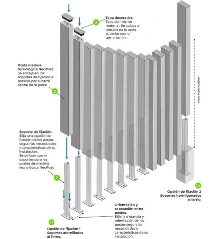 Con los soportes de fijación correctamente instalados y anclados, el siguiente paso es la instalación de los postes de madera composite NeoPost. Estos postes son la columna vertebral del panel de ocultación, proporcionando tanto estructura como estilo.