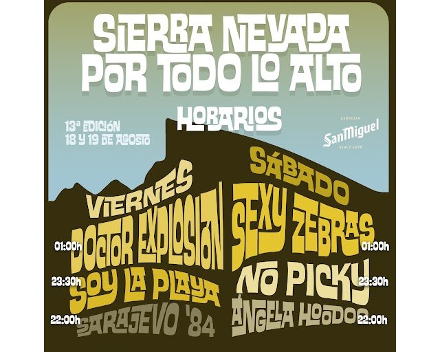 Este fin de semana el programa de verano de Sierra Nevada se pone las gafas de sol y los pantalones pitillo para disfrutar de las actuaciones de dos fuertes aniversarios rockeros con DOCTOR EXPLOSIÓN y los malagueños NO PICKY junto con los explosivos y muy bailables granadinos SARAJEVO 84 que presentarán su nuevo disco, además el trío de power rock ultra enérgico de SEXY ZEBRAS, que presentan en directo desbordante los temas de su recién estrenado álbum “Calle Liberación”. También actuarán SOY LA PLAYA, el proyecto paralelo de Pepe Medina (bajista de Airbag) con su pop cargado de melodía y la gran artista granadina de americana music ÁNGELA HOODOO. Dos noches de mucha altura.