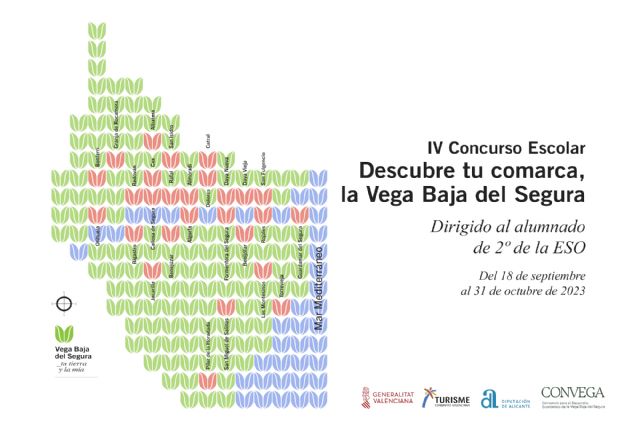 El Consorcio para el Desarrollo Económico de la Vega Baja (Convega) convoca el IV CONCURSO ESCOLAR: "DESCUBRE TU COMARCA, LA VEGA BAJA DEL SEGURA", dentro del Plan Dinamización y Gobernanza Turística de la Vega Baja del Segura, desarrollado con la colaboración de Turisme Comunitat Valenciana y el apoyo de la Diputación Provincial de Alicante.