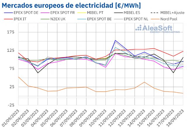Por lo que respecta a los precios horarios, el lunes 11 de septiembre, de 20:00 a 21:00, se registró un precio de 330,36 €/MWh en el mercado belga, que fue el más alto desde el 20 de diciembre de 2022 en este mercado. Ese mismo día, de 19:00 a 20:00, en los mercados neerlandés y alemán los precios fueron de 463,77 €/MWh y 524,27 €/MWh respectivamente, los más altos desde el 16 de diciembre de 2022 en esos mercados. Por otra parte, el lunes 18 de septiembre, de 23:00 a 24:00, se registró un precio de 0,29 €/MWh en el mercado nórdico, el más bajo desde la primera mitad de agosto.