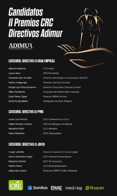 La Asociación de Directivos de la Región de Murcia ha anunciado a los candidatos de los II Premios CRC Directivos ADIMUR 2023. Unos premios que distinguen la labor de directivos/as dentro de la Región, bien por su especial contribución a la sociedad, bien por méritos obtenidos en el último año dentro de sus empresas, a criterio de un jurado formado por personalidades del ámbito institucional, académico y empresarial.