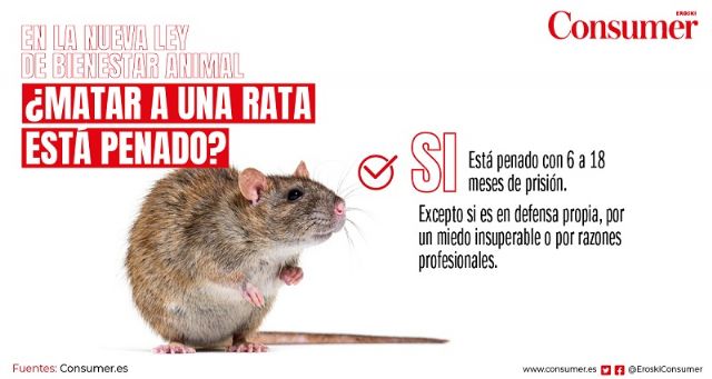 Consumer informa de que, con la entrada en vigor de esta nueva ley, matar a una rata o no evitar la reproducción de perros, gatos o hurones puede acarrear multas.