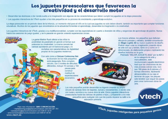 Los más pequeños podrán desarrollar su ingenio creando su propio circuito de canicas lleno de bajadas, curvas y lanzamientos, o dando vida con luces y sonidos a su nueva obra de arte. Estos juguetes interactivos preescolares harán las delicias de padres e hijos, y prepararán a los más pequeños para cualquier reto que les pueda deparar su salto a la educación primaria.