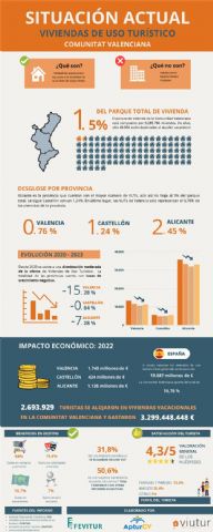 El citado estudio se ha elaborado con el análisis cruzado de los datos del Instituto Nacional de Estadística (INE), y las encuestas de FRONTUR (Movimientos turísticos en frontera), EGATUR (Encuesta de Gasto Turístico), ETRE (Encuesta de Turismo Residente), y el Barómetro de la Universidad de Salamanca, sobre las 49.950 Viviendas de Uso Turístico registradas en la Comunidad Valenciana, que representan el 1.5% de las 3.285.786 de unidades del parque total de viviendas (el 2.45% del parque de viviendas de la provincia de Alicante, el 1,24%, en Castellón, y el 0,76% en Valencia).