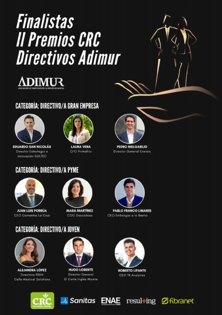 LaAsociaciónde Directivos de la Región de Murcia ha anunciado a los finalistas de la segunda edición de los Premios CRC Directivos ADIMUR del Año 2023. Unos premios que buscan distinguir la labor de directivas o directivos dentro de la Región, bien por su especial contribución a la sociedad, bien por méritos obtenidos durante el último año en el seno de sus empresas, a criterio de un jurado formado por personalidades del ámbito institucional, académico y empresarial.