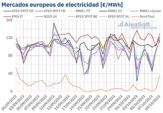 En cambio, en la primera semana de octubre también se registraron precios por encima de los 200 €/MWh en los mercados alemán, belga, italiano y neerlandés. El precio horario más alto, de 250,28 €/MWh, se alcanzó en el mercado alemán el día 5 de octubre, de 19:00 a 20:00. Además, el lunes 9 de octubre se alcanzaron precios horarios mayores a 200 €/MWh en los mercados alemán, belga, francés, italiano y neerlandés. Ese día, en los mercados español y portugués, de 20:00 a 21:00, se registró un precio de 184,50 €/MWh, el más alto desde marzo en estos mercados. En el caso del mercado N2EX del Reino Unido, el lunes 9 de octubre, de 19:00 a 20:00, se registró un precio de 184,24 £/MWh, el más alto desde agosto.