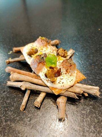 Sobre la espuma de berenjena, se añade el pescado, concretamente chicharro. Para redondear esta joya culinaria en miniatura laguardiense, el chef hace un guiño a las múltiples formas de conservación que se utilizaban en la Edad Media. Con la ralladura de limón hace referencia a los cítricos; con la anchoa, a la salmuera, que ya se utilizaba incluso en tiempo de los romanos. Y no podía faltar la referencia a los encurtidos con la alcaparra. Una hoja de capuchina, cierra el pincho tanto estéticamente como en su sabor.