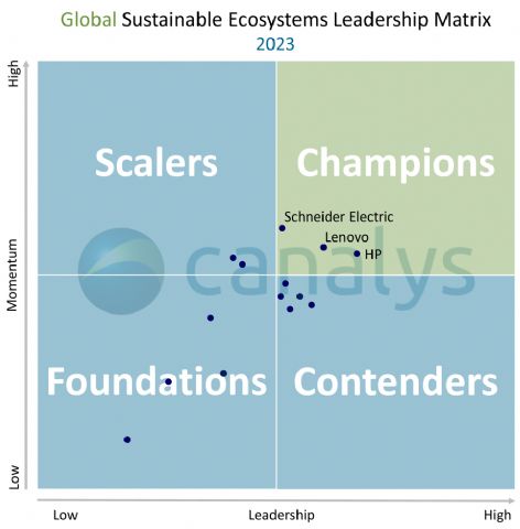 Schneider Electric también ha sido galardonada como Champion en la primera edición de la Sustainable Ecosystems Leadership Matrix de Canalys por demostrar la mayor excelencia a través de sus compromisos con la sostenibilidad en el canal, en comparación con sus homólogos del sector. Los criterios clave de evaluación incluyeron el liderazgo en sostenibilidad, las estrategias corporativas de sostenibilidad, la transparencia en los datos, el progreso y la transformación, y la opinión de los partner del canal.