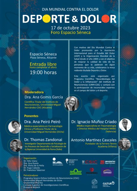 El programa científico Neurobiología del Dolor y la Inflamación del Instituto de Neurociencias (IN), centro mixto de la Universidad Miguel Hernández (UMH) de Elche y del Consejo Superior de Investigaciones Científicas (CSIC), ha organizado la mesa redonda 'Deporte y Dolor', que tendrá lugar mañana, 17 de octubre, a las 19:00 horas, en el Espacio Séneca de Alicante. En el evento, que se celebra con motivo del Día Mundial Contra el Dolor (#GlobalDayAgainstPain), participarán reconocidos especialistas para abordar el tema desde perspectivas tan diversas como la investigación clínica, la cirugía médica, la rehabilitación, la fisioterapia, o el entrenamiento y recuperación de deportistas de élite. La entrada es gratuita hasta completar el aforo.