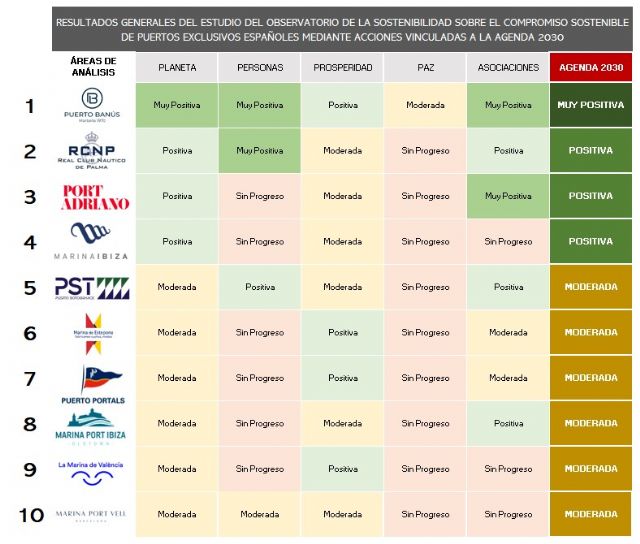 Según un informe publicado por el Observatorio de la Sostenibilidad: Puerto Banús, Marina Ibiza y el Club Náutico de Palma, los que más cumplen con los Objetivos de Desarrollo Sostenible según el estudio realizado por el Observatorio de la Sostenibilidad. En el estudio se consideraron parámetros como el cuidado del agua o la energía, así como el cambio climático, la protección de la biodiversidad marina y terrestre, entre otros