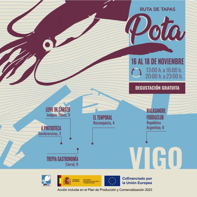 De jueves a sábado, desde las 13:00h. hasta las 16:00h. y desde las 20:00h. hasta las 23:00h., el público podrá disfrutar de distintas tapas como, por ejemplo: "Saam de pota crujiente, mayonesa cítrica y cebolla roja", en el Malasangre; "Sandwich club de pota con bacon y mayonesa de kimchi", en el Lume de Carozo; "Pota estilo siciliano con mojo rojo almendrado", en A Pintxoteca; "Guiso de pota con carne de pimiento choricero e hilos de chile en tostada de pan", en el Trepia Gastronomía y "Buñuelos de pota estilo brava", en El Temporal.
