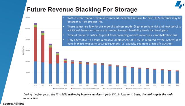 La clave para el despliegue masivo de baterías es que la inversión sea rentable. Para ello, según el presidente de AEPIBAL, es necesario el revenue stacking. Es decir, que las baterías diversifiquen sus ingresos y puedan participar en todo aquel servicio que les pueda generar ingresos. Esta remuneración por capas tiene tres grandes grupos diferenciados.
