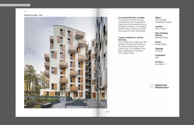 Este nuevo libro muestra de forma muy sugestiva la gran diversidad y el amplio espectro de los sistemas y productos de control solar de Griesser, que permiten satisfacer de forma selectiva las necesidades individuales de cualquier proyecto de construcción. Además, gracias al planteamiento interactivo de esta publicación, se puede mostrar de forma patente como estas soluciones de control solar se integran con total fluidez en las fachadas de edificios de toda Europa.