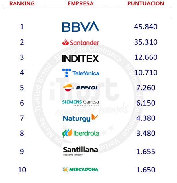 Por marcas, liderada el ranking la marca Bancomer BBVA, seguida por Santander, que ocupa la segunda posición, y por Movistar, que se alza con el bronce. Zara y Repsol, en cuarta y quinta posición, respectivamente, hasta completar el Top 5. Le siguen Gamesa, Gas Natural Fenosa, Iberdrola, Inditex, y Santillana hasta completar el Top 10 del ranking.