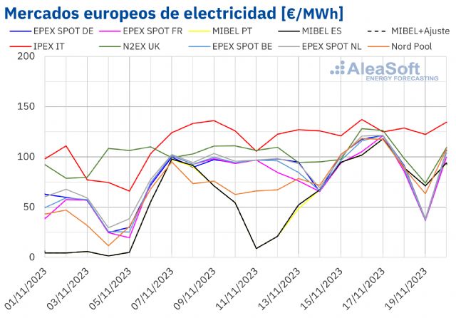 Durante los días laborables de la tercera semana de noviembre, los precios de los principales mercados eléctricos europeos registraron una tendencia alcista. Sin embargo, durante el fin de semana, la combinación de menor demanda y alta producción renovable ayudó a que los precios bajaran. En España se registró el récord de producción solar fotovoltaica para un mes de noviembre el día 19 y en Alemania la producción eólica del día 14 fue la más alta para un mes de noviembre