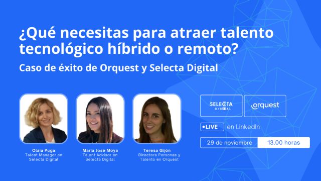 El mercado laboral se ha transformado en los últimos años y por ello surgen nuevas tendencias que afectan a la gestión de personas y a su forma de trabajar. Una de estas tendencias tiene que ver con los modelos de trabajo adoptados por las empresas a nivel global: el modelo híbrido y el modelo remoto. Pero, ¿cómo atraer talento tecnológico en estos entornos? Reclutar talento en estas modalidades requiere de nuevas tácticas y métodos y de todo ello se hablará en el webinar "¿Qué necesitas para atraer talento tecnológico híbrido o remoto? Caso de éxito de Orquest y Selecta Digital" organizado por la consultora de perfiles tecnológicos y digitales, Selecta Digital.