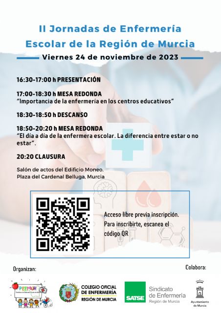 La Plataforma de Enfermería Escolar de la Región de Murcia (PEEMUR), el Colegio Oficial de Enfermería y el Sindicato de Enfermería SATSE han organizado conjuntamente las II Jornadas de Enfermería Escolar de la Región de Murcia, que se celebrarán este viernes, 24 de noviembre, en el edifico Moneo de la capital.