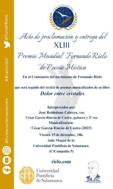 medalla conmemorativa, será fallado en acto público, el próximo 15 de diciembre, viernes, a las 18 horas de Madrid (España), en el Aula Magna de la Universidad Pontificia de Salamanca, organizado conjuntamente por la Fundación Fernando Rielo y la Cátedra Fernando Rielo de la Universidad Pontificia de Salamanca.
