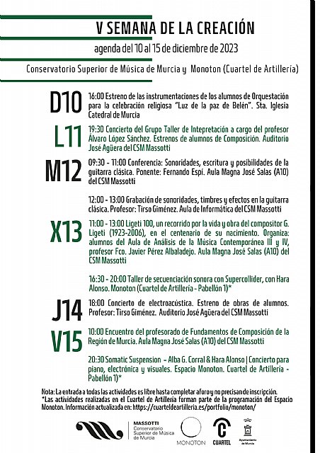 Los interesados en la música experimental y el arte contemporáneo tendrán hasta el 15 de diciembre para disfrutar de conciertos, talleres, seminarios y ponencias. Destacan las ponencias de los profesores Pérez Albadalejo, Espí, Hara Alonso, así como los proyectos de innovación y electroacústica llevados a cabo por Tirso Giménez, Alba G.Corral & Hara Alonso.
