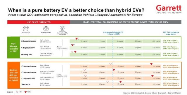 El análisis de Garrett complementa las conclusiones de otros estudios de ACV al evaluar factores como una amplia gama de tecnologías electrificadas (100% eléctrica, híbrida suave, híbrida, híbrida enchufable), diferentes segmentos de vehículos (compactos, SUV, deportivos y comerciales ligeros), el uso medio real de los vehículos en Europa, así como la intensidad de la generación de energía eléctrica para la producción y la carga de las baterías.
