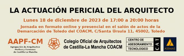 La Agrupación de Arquitectos Peritos y Forenses de Castilla La Mancha (AAPF-CM), una de las tres agrupaciones con las que cuenta el Colegio Oficial de Arquitectos de Castilla-La Mancha, convoca, para este próximo lunes 18 de diciembre de 17:00 a 20:00 horas, la jornada 'La actuación pericial del arquitecto'.