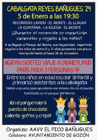 Todos los inscritos nacidos entre los años 2012 y 2023, recibirán un regalo personalizado después de la Cabalgata. El viaje a Disney (se sorteará entre los nacidos del 1 de enero de 2012 y el 31 de diciembre de 2020) es para tres personas e incluye vuelos desde Asturias, estancia en hoteles del parque, entradas, régimen de media pensión y traslados. Más de cien personas participan en la Cabalgata de esta parroquia de Gozón (Asturias), organizada y realizada por la AAVV "El Pico" de Bañugues