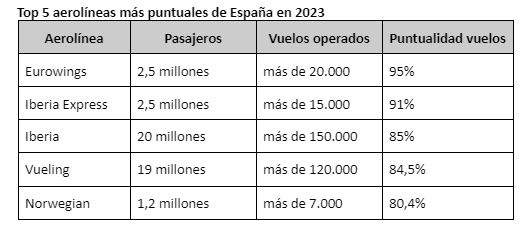 En línea con lo publicado en el AirHelp Score 2023, los vuelos más puntuales fueron los operados por Eurowings, que obtuvo la segunda posición en el ranking internacional. Más de 20 mil vuelos de la aerolínea alemana de bajo coste despegaron desde aeropuertos españoles, trasladando a más de 2,5 millones de pasajeros. La puntualidad de esta aerolínea se sitúa en torno a una tasa del 95% de vuelos en hora, son solo 1.000 vuelos interrumpidos.