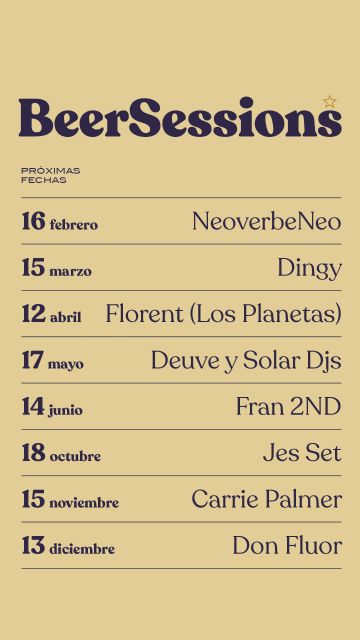 Estrella de Levante vuelve a organizar el encuentro más cervecero de los viernes con sus Beer Sessions, desde las 14.30 h hasta las 17.00 h con aperitivazo y sesión musical con maridaje entre canciones y cervezas de temporada, con algunas sorpresas este año en forma de actuaciones sorpresa y conducciones de la cata muy especiales. Habrá sesiones los días 16 de febrero, con Neoverbeneo, el 15 de marzo, tendremos en la sala a Dingy. Después vendrá a las Beer Sessions Florent (Los Planetas Dj set), el 12 de abril. El 17 de mayo estarán Deuve & Solar Djs , el 14 de junio Fran 2nd, el 18 de octubre, con Jes Set, el 15 de noviembre vendrá Carrie Palmer y cerrará la temporada Don Fluor, el día 13 de diciembre.