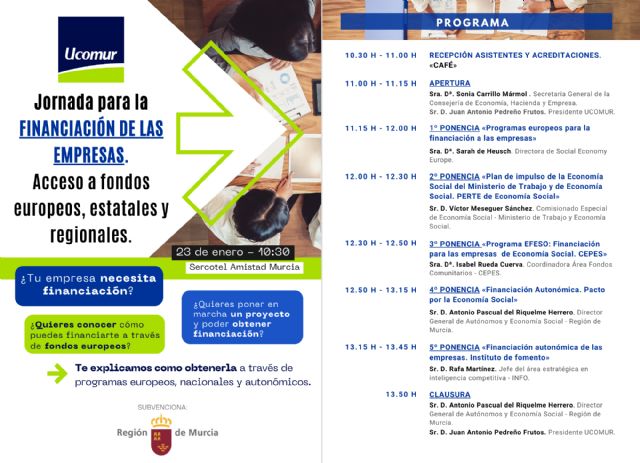 La apertura de la jornada, que comenzará a las 10:30 horas, correrá a cargo de la secretaria general de la Consejería de Economía, Hacienda y Empresa, Sonia Carrillo; así como del presidente de Ucomur, Juan Antonio Pedreño, al frente también de CEPES y Social Economy Europe.