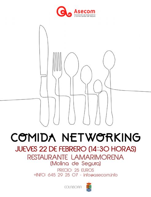 19/02/24 Este jueves 22 de febrero (14:30 horas) la Asociación de Empresarios y Comerciantes del Segura (ASECOM) celebrará una nueva comida-networking abierta a socios y amigos de la entidad. "Como siempre, servirá para juntarnos en torno a una mesa y hablar de nosotros, de nuestros negocios y de posibles colaboraciones", señala su presidente, Andrés Aráez.