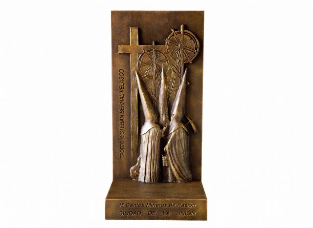 Para este premio, el artista unionense Esteban Bernal Aguirre, hijo del fundador del Festival Internacional del Cante de las Minas que da nombre a este trofeo, ha sido el encargado de tallar esta obra de 25 cm de altura en altorrelieve cuya iconografía recoge los elementos del concurso con la elegancia que caracteriza su creación. En la parte central, cuenta, aparecen tres cofrades vestidos con túnica, capa y capuz, en un distendido encuentro en el que uno de ellos canta acompañándose con una mano, a la vez que en la otra lleva una discreta y casi escondida guitarra, instrumento de acompañamiento musical de los cantes mineros. Este personaje representa el cante. A la derecha, otro cofrade porta un pico al hombro y una lámpara minera que coloca en la parte central del grupo, elementos específicos de la Semana Santa unionense, y que representa a todos los penitentes y cofrades unionenses. En el centro el tercer personaje hace alusión a los aficionados y espectadores que de manera más anónima escuchan y disfrutan del evento. El trofeo se completa con una cruz pasional y dos castilletes.