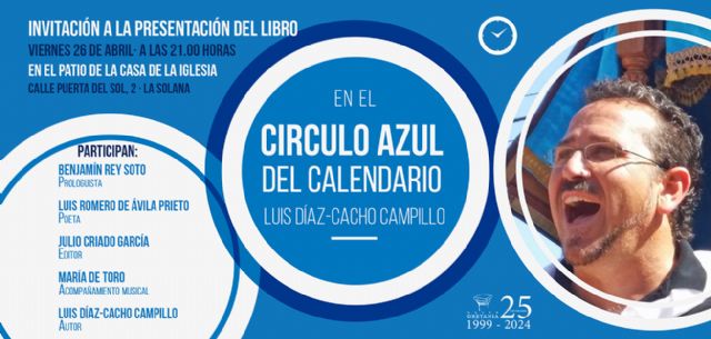 El viernes, día 26 de abril, a las 21:00 h., tendrá lugar la presentación del libro publicado por Ediciones C&G, "En el círculo azul del calendario", en el Patio de la Casa de la Iglesia, situado en la calle Puerta del Sol, 2. La entrada es libre hasta completar aforo. Acompañarán al autor, el prologuista del libro y párroco de La Solana, Benjamín Rey Soto; el poeta, Luis Romero de Ávila Prieto y el editor Julio Criado García. El apartado musical estará a cargo de María De Toro. En el libro, el poeta solanero Luis Díaz-Cacho acota sus colaboraciones, discursos, presentaciones e intervenciones a los años 2011-2021, periodo en el que ejerció de alcalde en su pueblo.