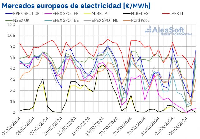 El 4 de abril se registró un récord histórico de producción solar fotovoltaica en el mercado portugués, al sumar 16 GWh producidos con esta tecnología. En el mercado italiano también se estableció un hito de producción con energía fotovoltaica, al registrarse el 6 de abril el segundo mayor valor de la historia, de 119 GWh, solo 190 MWh por debajo del récord histórico alcanzado el 17 de junio de 2023.