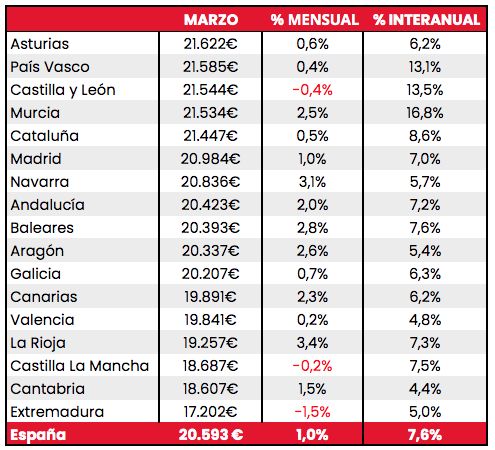 En precios absolutos, la comunidad con el precio medio de oferta más elevado de España en marzo ha sido Asturias (21.622 euros). En segundo lugar, se sitúa el País Vasco (21.585 euros), seguido de Castilla y León (21.544 euros), Murcia (21.534 euros) y Cataluña (21.447 euros). Por otra parte, Extremadura es la única por debajo de 18.000 euros (17.202 euros).